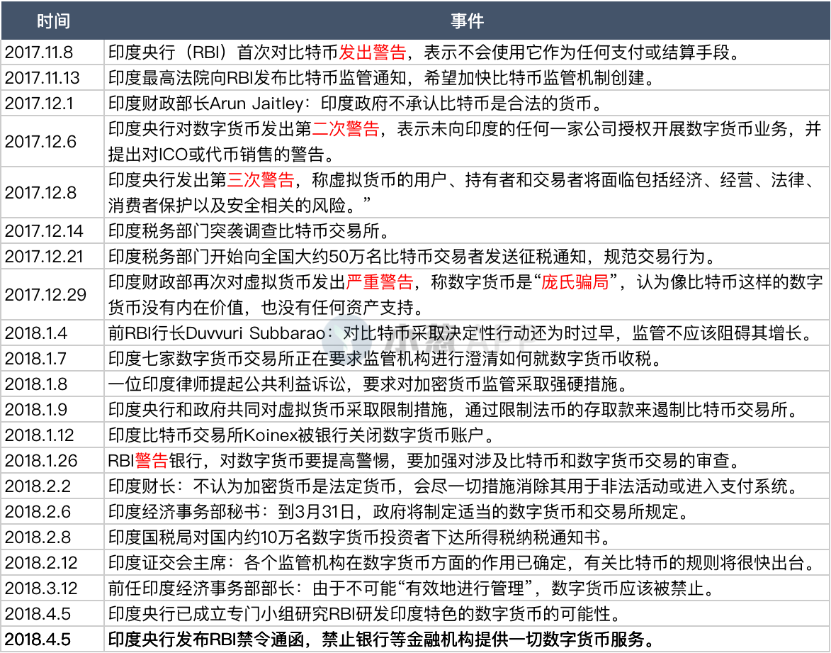 · 2018年1月开始,RBI和莫迪政府共同对虚拟货币采取限制措施,主要是通过限制印度卢比(INR)的存取款来遏制比特币交易所,RBI还警告银行加强对涉及比特币和数字货币交易的审查。
