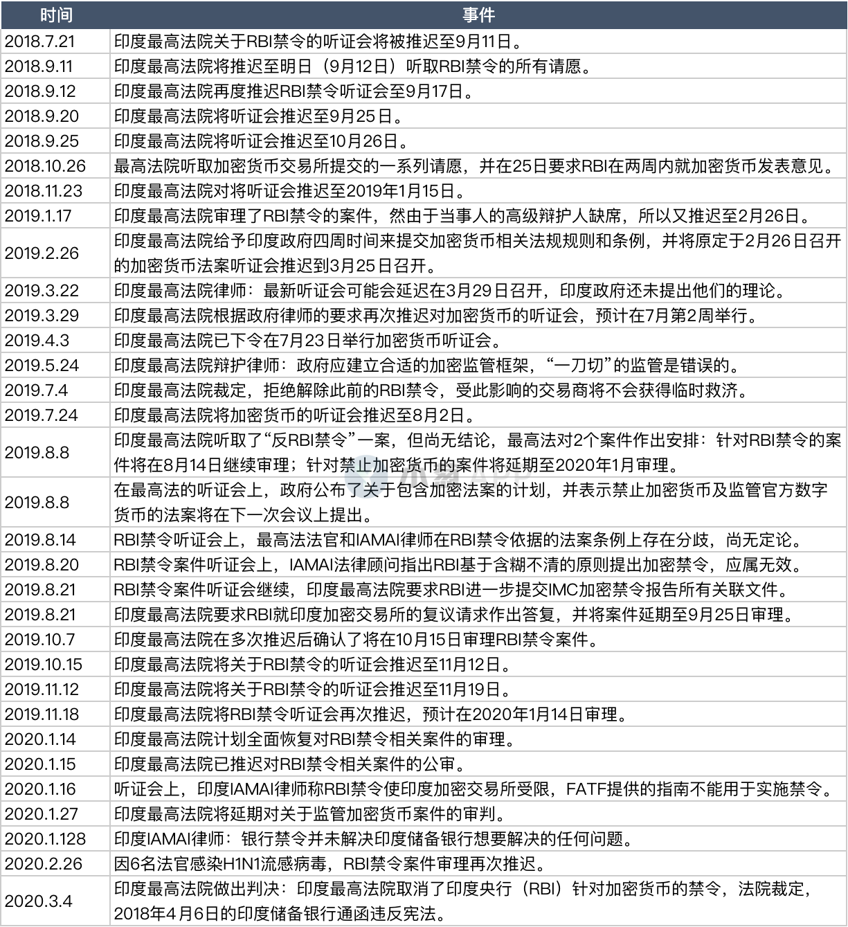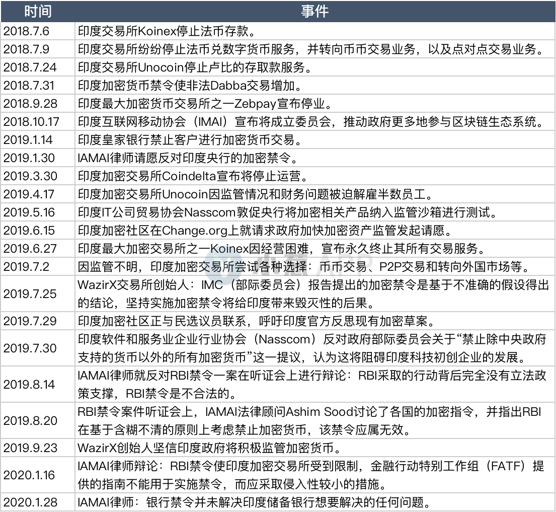 关于RBI禁令一案,主要是“印度加密社区”与“印度央行”的对峙。此案自RBI禁令实施(2018.7)后开始,经历了漫长的审理过程,最终在今年3月有了阶段性成果。