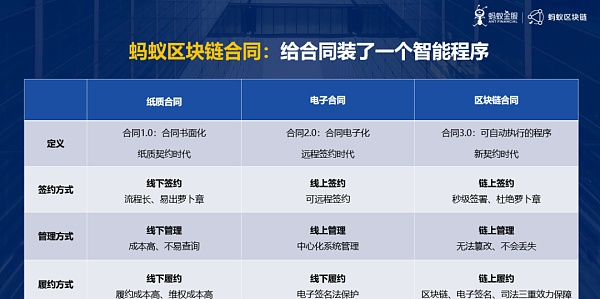 在疫情后的复工复产中,中小企业对数字化合同需求倍涨,但大多数企业还在经历没有完全电子化的电子合同,打印、盖章这些传统流程一个也没有少。蚂蚁区块链将合同全生命周期在链上完成:链上签约、管理和履约。区块链合同和传统法律合同一样,但它由区块链中的程序来运行,相当于在合同里安装上一个自动化程序,让合同变得智能和可信。