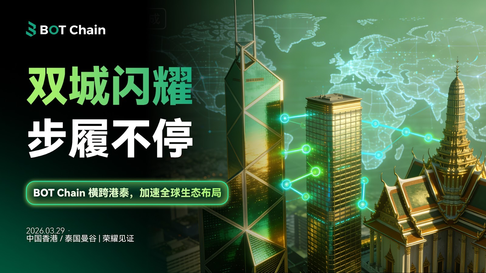 2026年3月23日,据官方消息确认,全球领先的模块算法网络 BOT Chain 将于2026年3月29日,在中国香港与泰国曼谷同步举办两场行业顶级盛会。这是 BOT Chain 首次实现“双城联动”的全球化布局,标志着其从技术叙事向全产业链落地、从区域深耕向国际资本深水区的全面迈进。