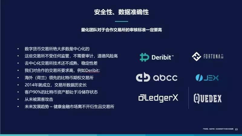 我们对交易所的要求是比较高的,因为我们必然要保护客户的资产,要保障他们资产的安全性。我们现在合作的交易所是比较少的,我们非常谨慎,主要在跟荷兰一个叫Deribit的交易所合作。他们做得比较早,14年就开始开发,16年上线。他们安全性做得非常好,90%的客户资产都放在钱包里,也从来没被黑客动过。