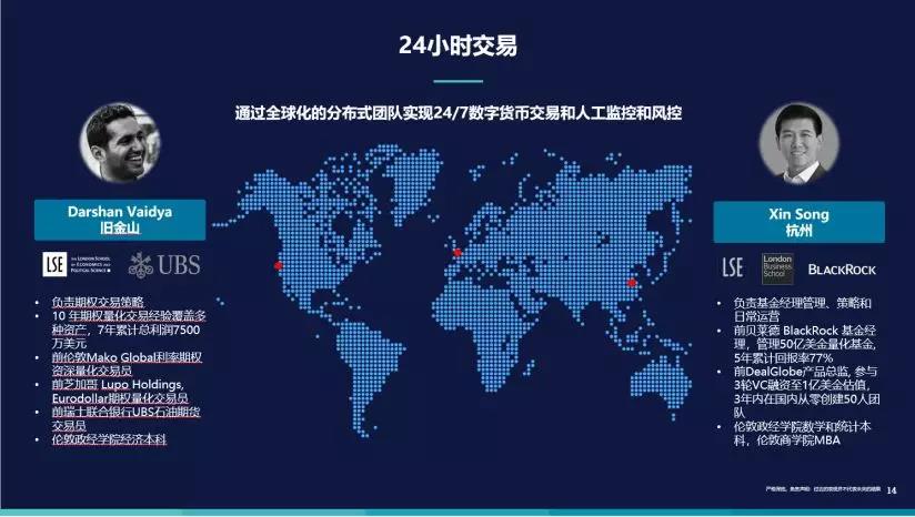 第二个问题就是24小时交易问题。因为传统金融市场交易所可能早上9:30到下午4:30,其他时间就不能交易,可是数字货币不一样。所以我们解决方案就是布局一个全球化的分布式交易团队,在中国、美国和欧洲都有人。