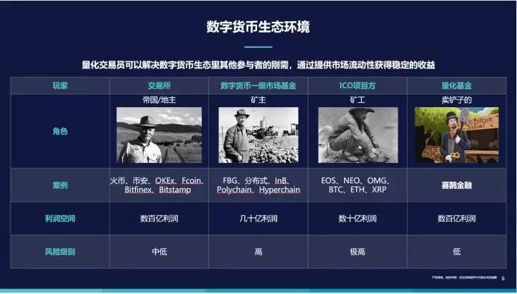 首先地位最高就是地主。如果看黄金市场,地主是决定游戏规则的。数字货币市场的地主就是交易所,无论市场好坏,无论项目做得好不好,交易所都有赚钱的办法,有上币费,有各种手续费交易费等等,所以他们相对来说风险是最低的。下一个角色就是矿主。矿主贡献资金和资源来支持项目方。数字货币里面的矿主就是Token Fund数字货币基金。后面的角色就是矿工。数字货币领域的矿工就是项目方。因为项目方风险是最高的,贡献时间去做项目、做公链、做应用,期间风险是非常大的。当然做成功的项目,回报率也是最高的。