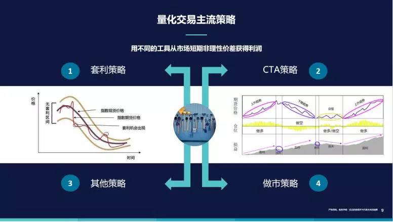 二、CTA策略。其实是趋势跟踪的一种策略,用一些短期的指标判断市场什么时候会涨,什么时候会跌。涨的时候就做多,跌的时候做空,通过期货来盈利。该策略也是主流的,有很多机构在做,可是因为近期市场没有太大波动,也没有很明显的方向,很多团队在这方面也没有办法获取很好的利润。