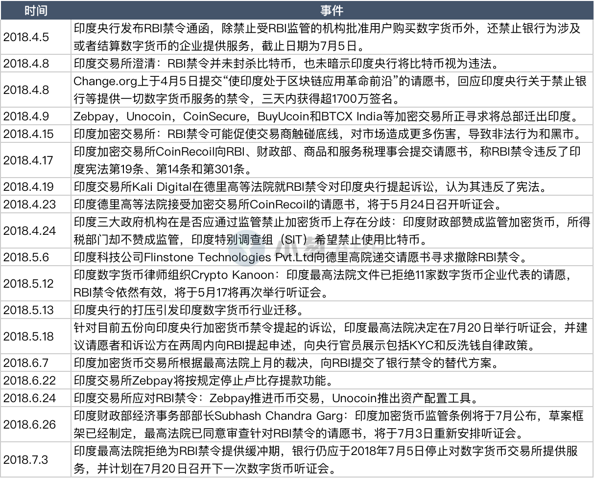 2018年4月5日,印度央行发布银行对数字货币的服务禁令(简称RBI禁令)通函,禁止受RBI监管的金融机构批准用户购买数字货币,且禁止银行为涉及或者结算数字货币的企业提供服务,若已经提供这类服务,必须在2018年7月5日前终止。禁令出台后,印度各大加密交易所日均交易量和代币价格均出现急剧下降,主流交易所负责人皆对这项禁令感到愤懑和不安,不少交易所开始寻求将总部迁出印度,同时多家交易所就RBI禁令向印度最高法院提交请愿和上诉。