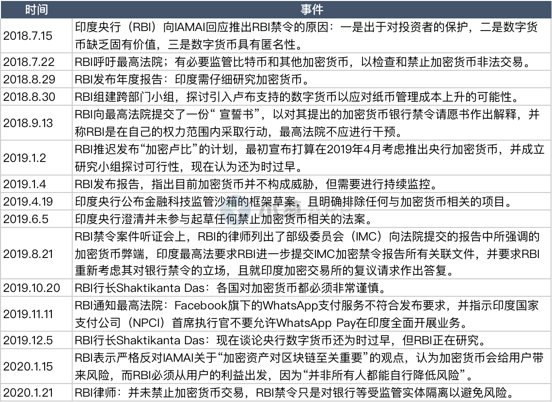 关于RBI禁令一案,主要是“印度加密社区”与“印度央行”的对峙。此案自RBI禁令实施(2018.7)后开始,经历了漫长的审理过程,最终在今年3月有了阶段性成果。