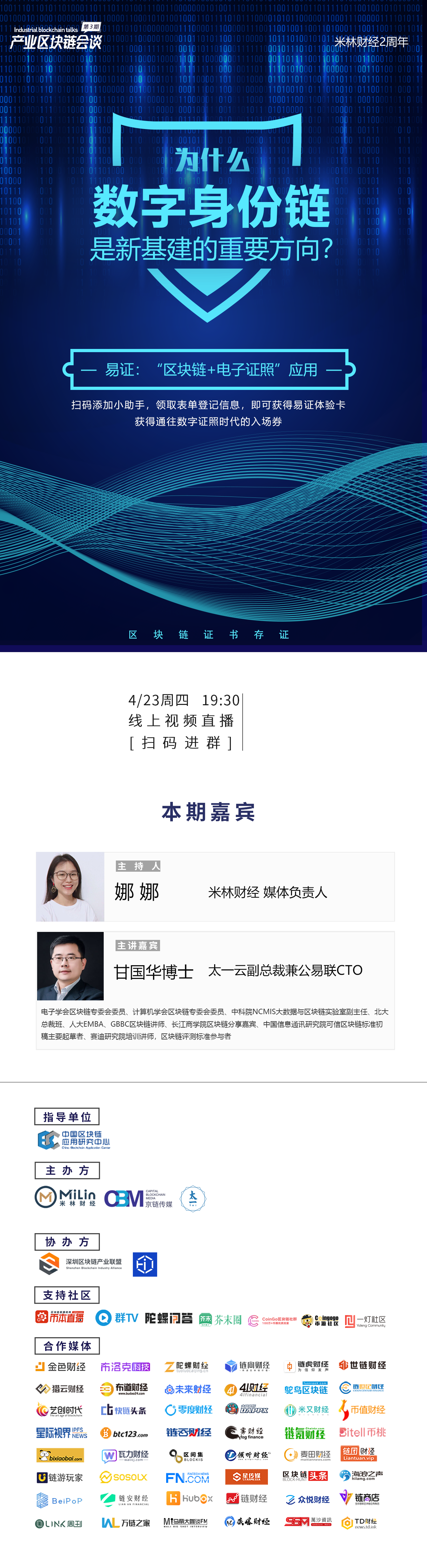 4月23日19:30,《产业区块链会谈》第3期社群直播顺利展开。本期主题为“为什么数字身份链是新基建的重要方向?”我们邀请到太一云副总裁兼公易联CTO甘国华博士和我们分享数字身份最前沿的应用——由公安部第三研究所作为指导单位的eID数字身份链。