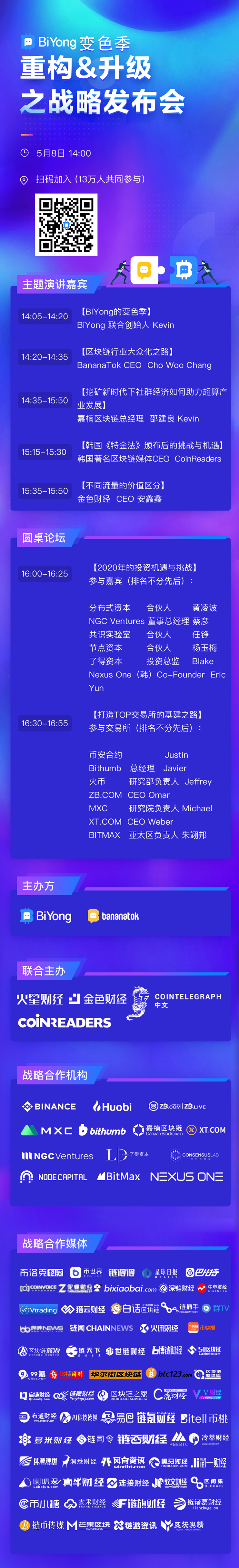 2020年5月8日,由BiYong和BananaTok主办,金色财经、火星财经、Cointelegraph中文、韩国CoinReaders联合主办的BiYong变色季重构&升级战略发布会隆重来袭,