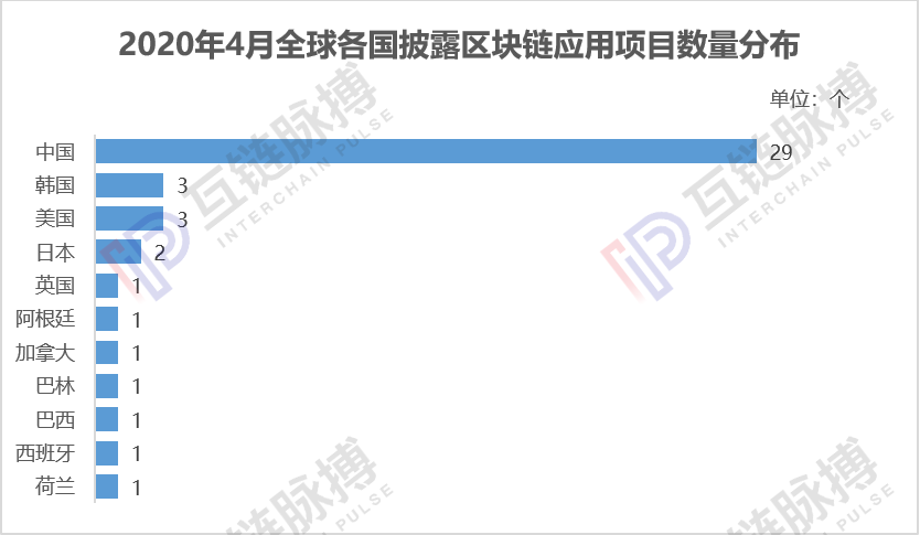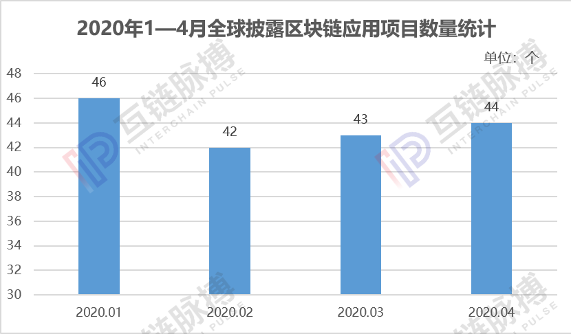 据互链脉搏研究院(IPRI)统计数据显示,2020年4月,全球共披露区块链应用项目44个,数量与3月份基本持平。其中,中国披露区块链应用项目29个,环比下降了25.6%。