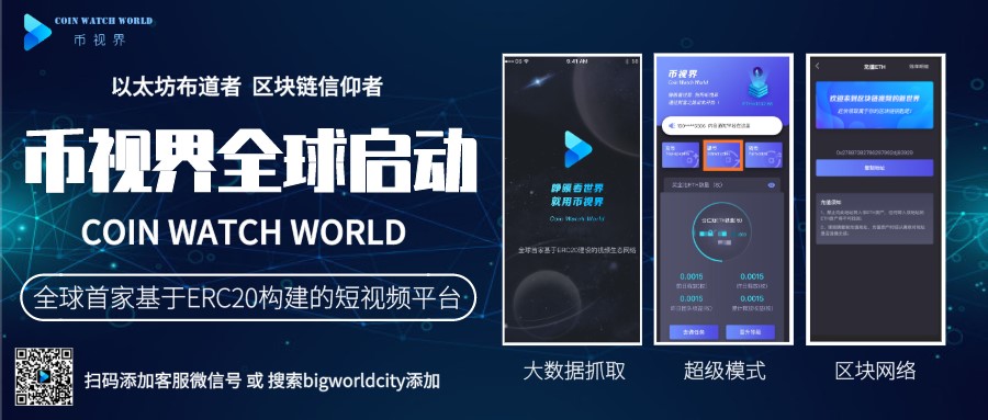 【Coin Watch World币视界】是全球第一家基于ERC20区块网络生态构建的短视频平台,将整合YouTube视频资源、Facebook社交媒体广告资源和抖音、快手等短视频资源,通过与ERC20区块网络相结合打造出首个链上视频广告生态。
