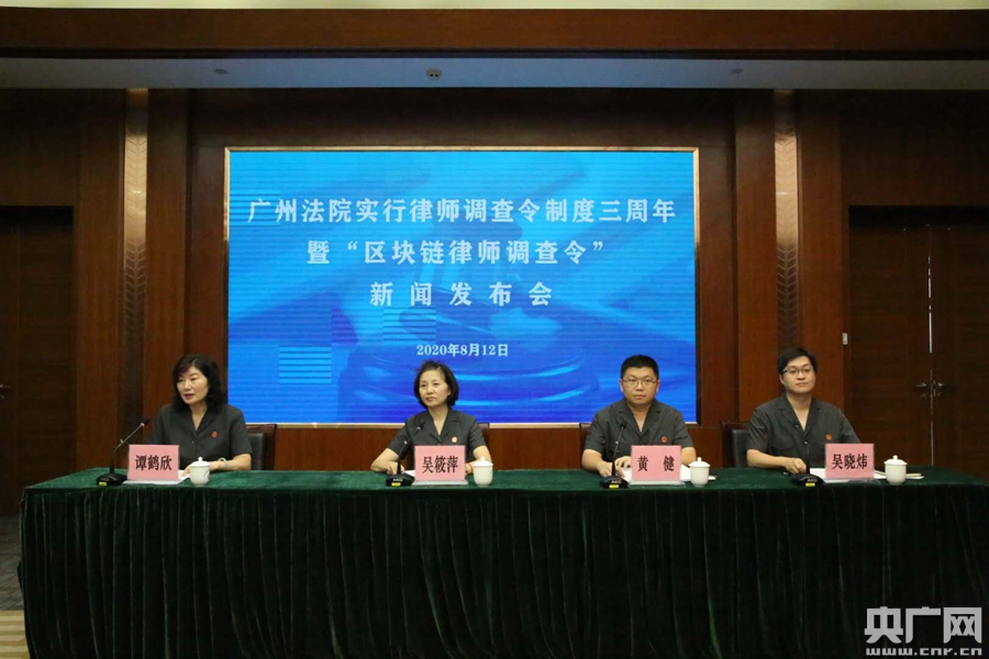 发布会现场(央广网发 罗伟雄 摄) 央广网广州8月12日消息(记者郑澍 通讯员黄乾 吴晓炜)8月12日,广州市中级人民法院召开广州法院实行律师调查令制度三周年暨区块链律师调查令...