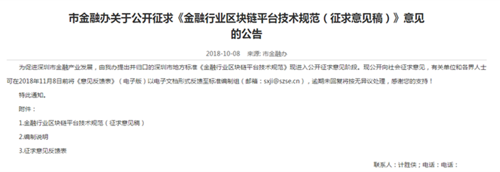 近日,深圳市金融办官网发布“关于公开征求《金融行业区块链平台技术规范(征求意见稿)》意见的公告”,就深圳市地方标准《金融行业区块链平台技术规范》公开征求意见,有关单位和各界人士可在2018年11月8日前反馈相关意见。