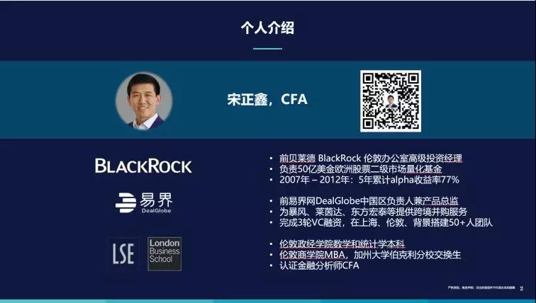 首先,做个简单的自我介绍。我最早是2007年加入贝莱德伦敦办公室,担任欧洲二级市场的基金投资经理。当时负责一个50亿美金的基金,听起来比较大,可是对比这个公司的总资产其实不算什么的。贝莱德总资产加起来大概是六万亿美元左右,所以我们负责的基金其实不到千分之一。从这里可以看到传统金融行业比数字货币的整个市值还要大很多。现在数字货币大概两千亿美元的市值,所以数字货币市场还有很大的发展空间。