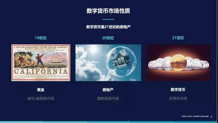 所有资产市场都会有泡沫,都会有涨有跌。从19世纪开始的黄金时代,很多美国人从东海岸跑到西海岸去挖黄金;20世纪的房地产泡沫;21世纪的数字货币市场。我们可以看到所有的金融市场都会有泡沫,因为人的属性没有变,还是希望一夜暴富,把各种资产的价格炒得比较高。数字货币好比21世纪的房地产,只是规模比之前的房地产市场更大,是全球化的一个市场。