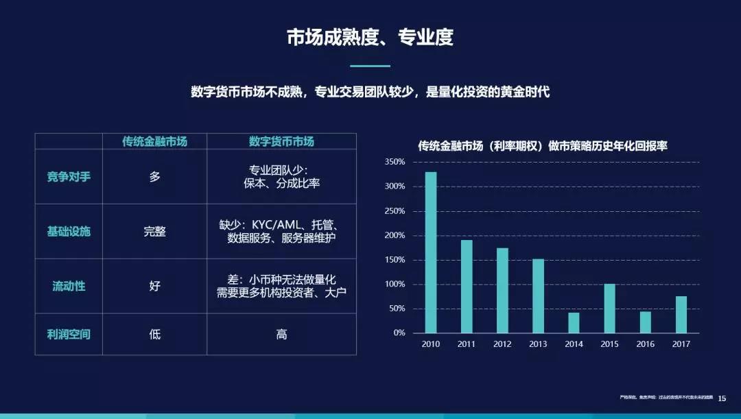 举个例子,我们在传统金融市场里看到这样的发展,下边的图表是我们在利率期权市场里过往7年的历史回报率。最早10年的时候也没有什么专业团队在这个市场里做市。我们是比较早进入这个行业的,那时候回报率非常高,超过300%。后面整个技术变得更成熟,也更多专业团队入场,利润和回报率也在逐步下降。可是数字货币市场现在还处于比较早期的阶段,可能是期权市场12、13年的阶段,所以利润空间还是非常大的。