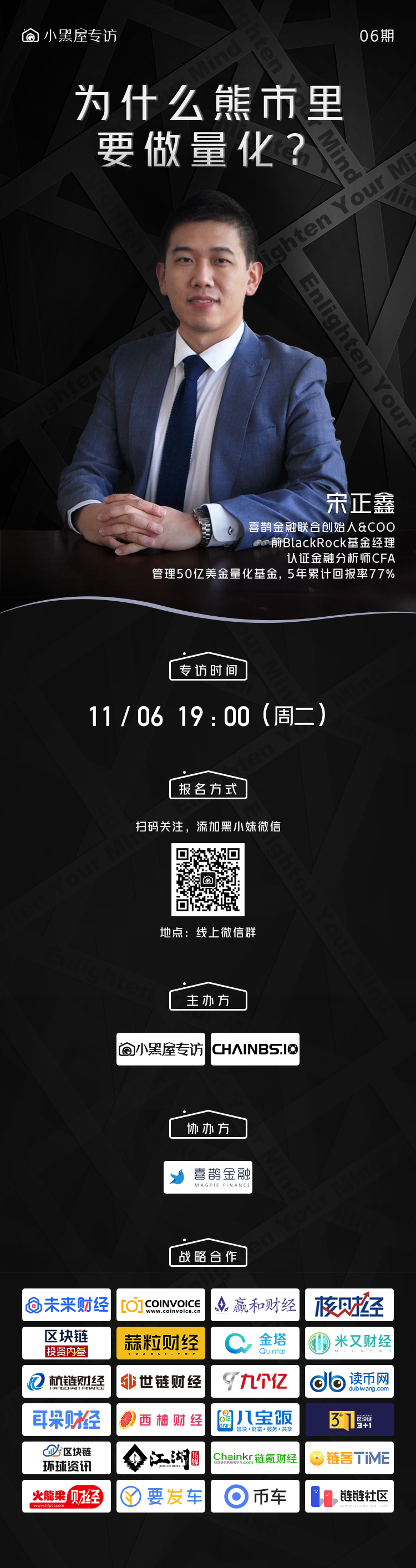 6日小黑屋专访06期,喜鹊金融COO宋正鑫做客小黑屋专访,在活动微信群就《为什么熊市里要做量化?》展开了精彩的分享与论述。以下是黑小妹整理的课堂笔记,宋总分享的精华内容~